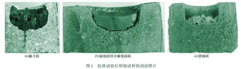抗渣試驗采用靜態(tài)坩堝試驗方法,在試樣的中間鉆取內孔φ36mmX30mm的坩堝試樣,將20g煙塵渣放入坩堝內孔中,在1300℃保溫24h后,沿坩堝中心軸切開,觀測其侵蝕情況,試樣的剖面照片見圖1,可以看出:粘土磚侵蝕最為嚴重,氮化硅結合碳化硅磚次之,鎂鉻磚幾乎沒有侵蝕。
