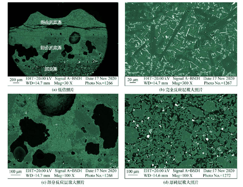 抗渣試驗后的鎂鉻磚試樣可分成附渣層、致密界面層、滲透反應層和原磚層四層。根據(jù)各層的放大照片分析認為:高溫下液態(tài)煙塵渣能滲透到鎂鉻磚中,但鎂鉻磚中主要成分方鎂石、鎂鉻尖晶石不容易與煙塵渣反應生成低熔點物相,因此鎂鉻磚具有優(yōu)異的抗煙塵渣侵蝕性。