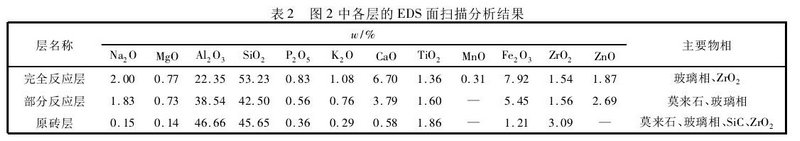 抗渣試驗后粘土磚試樣的SEM照片見圖2,由圖2a可以看出,侵蝕后試樣可分為完全反應層、部分反應層和原磚層三成。根據(jù)各層的放大照片圖2(b)、圖2(c)和圖2(d)一級各層的EDS面掃描分析結果(見表2),經分析認為:高溫下液態(tài)煙塵渣與粘土磚接觸后發(fā)生滲透、侵蝕反應,粘土磚中的主要成分SiO2、AL2O3容易溶解到煙塵渣中。因此粘土磚抗煙塵渣侵蝕性較差。