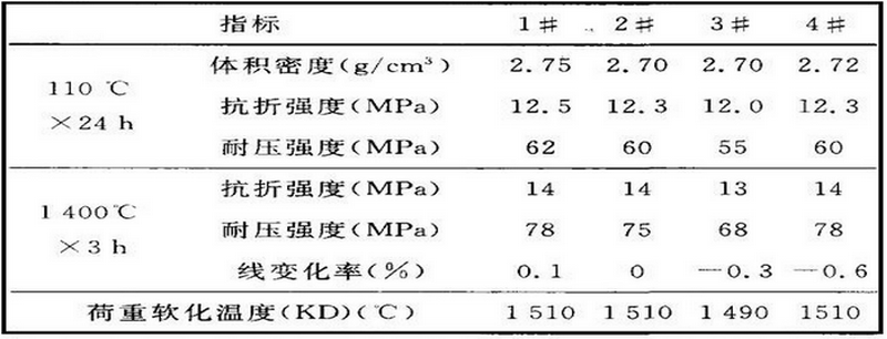 按照比例配好料經(jīng)加水混合均勻后,倒入模具中振動(dòng)成形為40mmX40mmX160mm試樣各6組,在室溫下養(yǎng)護(hù)24h后脫模,測(cè)試110℃X24h 處理后體積密度、抗折強(qiáng)度、耐壓強(qiáng)度和1400℃X3h處理后抗折強(qiáng)度、耐壓強(qiáng)度、荷重軟化溫度、燒后線(xiàn)變化率。實(shí)驗(yàn)結(jié)果見(jiàn)表2