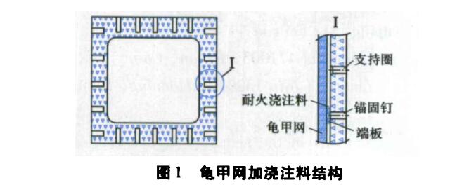此方型煙道原襯里結構為龜甲網加澆注料,見圖1。煙道截面為正方形,邊長2000mm,長度大約1200mm,煙道人口溫度近1000℃,出口溫度大約為800℃。由于煙道截面尺寸較大,油煙氣不斷沖刷襯里耐火澆注料,龜甲網發生變形,導致煙道澆注料逐漸脫落,將與煙道殼體直接相焊的錨固釘、支持圈燒紅,操作人員無法靠近不僅留下了安全隱患而且下一道生產所需熱能也不能保證供給。