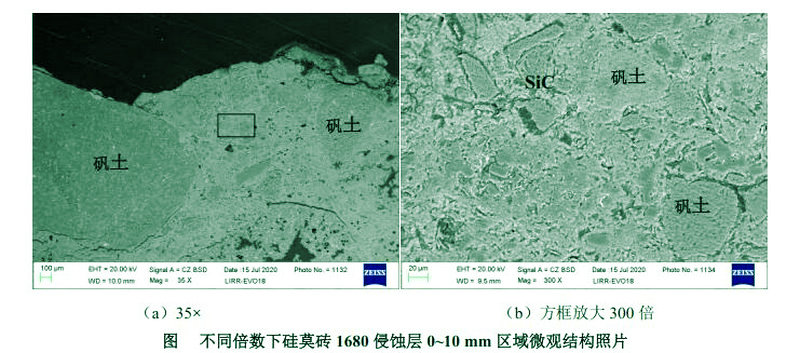 下圖為堿侵蝕后硅莫磚1680侵蝕層0~10mm 區(qū)域不同倍數(shù)下的SEM 照片。從圖(a)觀察發(fā)現(xiàn):接觸K2CO3的坩堝底部表層結(jié)構(gòu)致密,大顆粒邊緣部分區(qū)域出現(xiàn)裂紋。從圖(b)觀察看出:基質(zhì)中礬土顆粒邊緣被侵蝕明顯,碳化硅無(wú)明顯變化。