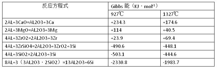 除了碳化物(碳化硅)、硼化物以及氮化物外,大部分氧化物很容易被鋁還原產生潤濕。表1列出了耐火材料的氧化物和液態鋁之間的反應自由能。