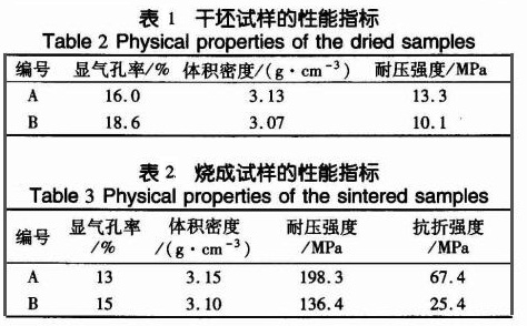干坯的常溫性能指標(biāo)如表1,可燒成試樣的常溫性能指標(biāo)見表2.從表1中可以看出,加入硅粉后,坯體趨于致密化,顯氣孔率降低,體積密度、耐壓強(qiáng)度都提高了。這說明加入硅粉后,在壓力相同時(shí),材料的組織結(jié)構(gòu)比原先更加致密。