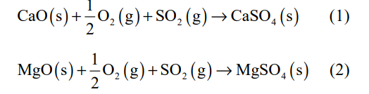 銅冶煉中硫化物由于氧化形成氣態SO2,并遷移到耐火磚中,隨著溫度降低到1050℃以下,SO2 轉變為 SO3 的硫氧化物會與鎂鉻磚中氧化物反應,生成主要由MgSO4和CaSO4 組成的低熔點堿土金屬硫化物,導致鎂鉻質耐火材料成分的變化。其次 SO2–O2 的氣體擴散到殘磚冷面的類原磚層,由于晶界處的鈣鎂橄欖石的離解,氣相介質中SO2/SO3 與磚中CaO 反應生成 CaSO4。分析證實,殘磚冷面反應層存在 CaSO4 物相。當氧分壓為10-9 ~10–5MPa,SO2分壓為0.01~0.10 MPa,熔煉溫度在1200℃條件下,硫酸鎂的形成溫度為 700~800 ℃。MgO與氣體中的SO2反應生成 MgSO4,式(1)和式(2)相關反應會引起體積膨脹,當爐襯溫度下降時,耐火材料冷面形成的 MgSO4 再分解成 MgO,MgSO4 密度低,僅為 2.66 g/cm3,而MgO的密度為3.58 g/cm3。因此,MgSO4 分解所形 成的 MgO 結構較為疏松,最后導致該處的鎂鉻耐火材料更易受到爐渣等介質的侵蝕。