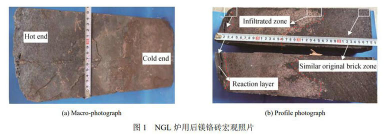 NGL 精煉爐對廢雜銅再生利用有重要意義,能緩解銅精礦資源的不足。然而 NGL 精煉爐廢雜銅所含雜質過多(含 Pb、Zn、As、Ni、Fe 等金屬元素)且需反復氧化和造渣,致使爐襯耐火材料服役環境苛刻。通過分析NGL 爐用后鎂鉻磚宏觀形貌、 物相組成及顯微結構,以期揭示 NGL 廢雜銅精煉爐用鎂鉻磚的損毀機理,為銅冶煉用耐火材料的發展和應用提供更多的科學依據。
