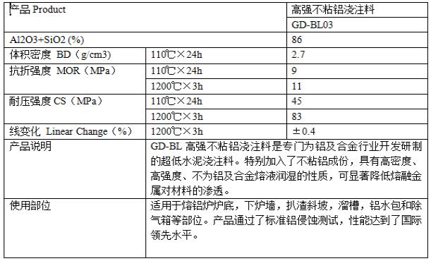 此系列材料以高純莫來石、紅柱石、硅線石為基料的低水泥含量、超微粉結合的新型材料。由于選用高純原料、超微粉結合,此系列材料具有高體積密度、高強度、良好熱震穩定性,通過添加適量的“不潤濕劑”(如高純氧化鉻、復合鋇鹽、復合鋅鹽等),能大幅度降低鋁及合金、熔渣對耐火材料的潤濕性,提高了耐火材料對含鹽分、助熔劑等化學成分的鋁液的抗腐蝕性、抗沖刷性、不沾鋁和渣功能,即阻止了鋁及合金、熔渣滲入耐火材料,延長爐襯壽命。非常適用于熔化爐、靜置爐、流槽、鋁包內襯。